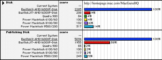 At a glance, performance of MacOS 7.5.5 emulated on Basilisk II running on AMD Athlon XP 1600+ CPU (1.4 GHz) roughly equals to Power Macintosh 6100/60 (PowerPC 601 CPU/60 MHz), except disk scores. The enormously high disk scores may be explained by my assumption that Linux simply cached in RAM portions of HFS disk image used by benchmarking software. However, I have used first-generation Power Macintosh 6100/60 in the past, and can only recall that it have been hell slow. On the other side, Basilisk II on Linux/AMD Athlon XP 1600+ is very very fast - it loads MacOS 7.5.5 within 3 or 4 seconds. Finder operations are completed almost instantly. Stuffit and Retrospect are also snappy. My last word - this system is the fastest MacOS 7 workstation I have ever seen. The Future Currently programmers are busy developing Basilisk II with JIT (Just In-Time Compiler), which will perform on the fly compilation of 68k codes into x86 ones. This cool feature will greatly increase speed of CPU intensive tasks. I have tested Basilisk II v1.0 with JIT beta v0.6, it looked really promising. CPU and FPU scores increased by over 2.6 and 7 times respectively. Disk performance have been significantly lower with JIT on, I have no explanation for this side effect, however (on the graph below JIT scores are in the row #2).