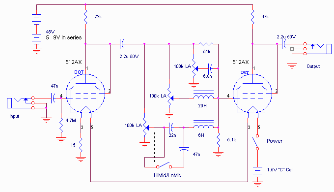 In this circuit, a single C cell provides filament power for both tubes. Due to the series filament connection, the first stage has 0.25V of cathode bias applied and about 0.3V of contact bias for roughly 0.55V of bias. In the triode connection shown, the effective plate resistance for this connection is about 33k, so the stage gain is about 3, with an effective impedance to the tone stack of about 13k.